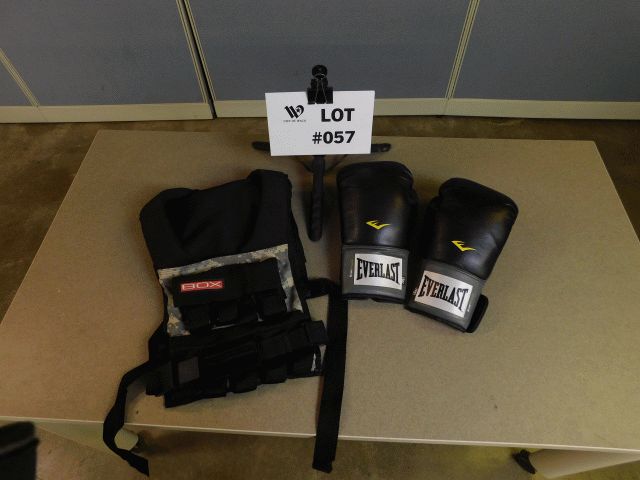 Lot containing 1 pair of Everlast 16oz boxing/training gloves and 1 BOX weight vest. All units have wear and tear . Operational condition unknown; Inspection and Removals: Appointments are MANDATORY - no appointment, no inspection, no removal. Appointments must be made 24 hours in advance; Location 1