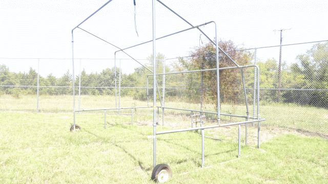 Portable baseball backstop 18' x 12', disk golf items, and pitching L-Screen; Location 120