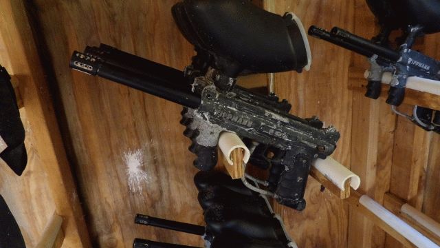 Approximately 25 paintball guns, masks, and CO2 canisters; Location 23