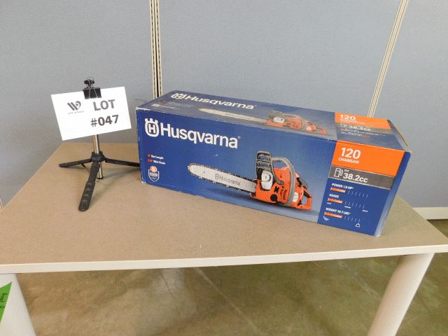 Lot of 1 Husqvarna 120 Chainsaw, 16" bar, 3/8 mini bar, 38.2cc gas motor, product #970515016 SN #20214501751. Unit is in sealed box; Inspection and Removals: Appointments are MANDATORY - no appointment, no inspection, no removal. Appointments must be made 24 hours in advance; Location 1