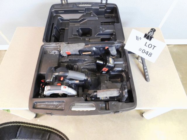 Lot containing Approximately 3 Craftsman 19.2v tools, 1 hand held fluorescent light # G540, 1 5.5 trim-saw #g0540, 1 reciprocating saw, 1 19.2 volt battery and case. All units have wear and tear and no charger . Operational condition unknown; Inspection and Removals: Appointments are MANDATORY - no appointment, no inspection, no removal. Appointments must be made 24 hours in advance; Location 1
