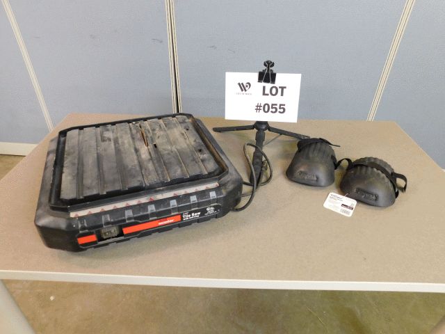 Lot of 1 Drill Master 4.50" portable tile saw with wet tray model #69230, 120v, 5300 RPM and knee pads. Unit has visible wear and tear, and damage. Operational condition unknown; Inspection and Removals: Appointments are MANDATORY - no appointment, no inspection, no removal. Appointments must be made 24 hours in advance; Location 1