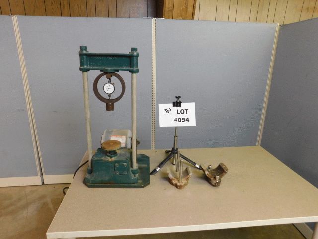 Humboldt asphalt specimen stability & flow tester, 10,000 lb., cat #1339, Model PR2162,115v, on wood base. Unit has visible wear and tear, oxidation and rust. Approximately 12"wide x 14"deep x 25" high does not include wood base; Inspection and Removals: Appointments are MANDATORY - no appointment, no inspection, no removal. Appointments must be made 24 hours in advance; Location 1
