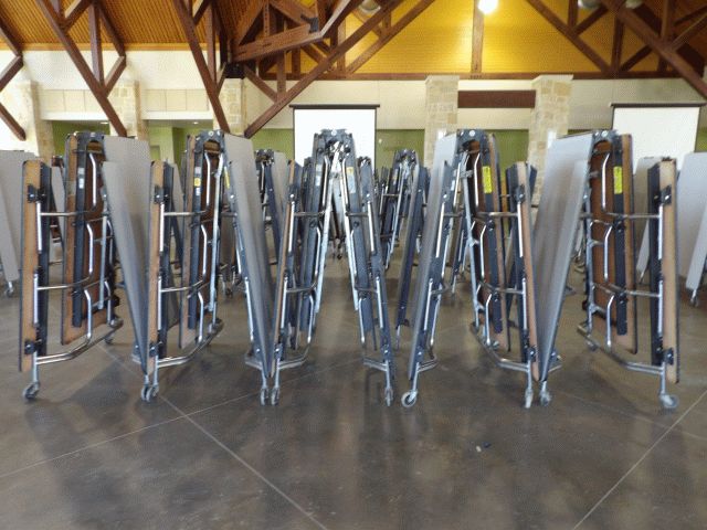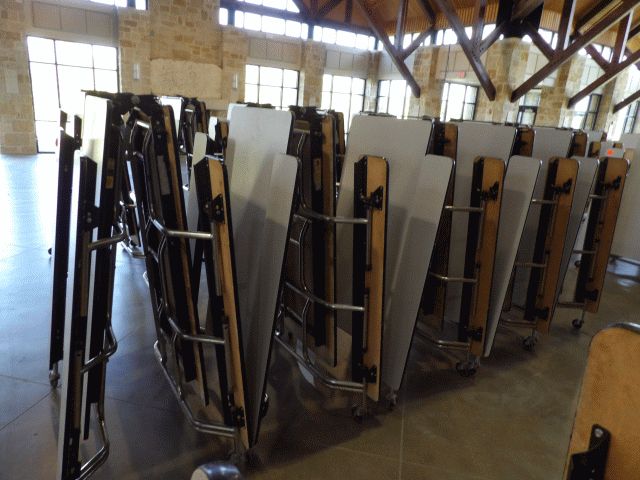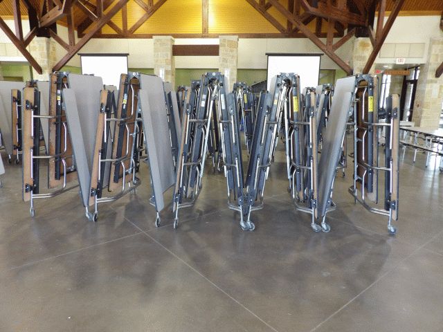 Lot of 5 folding/rolling cafeteria tables with attached seats; Location 117