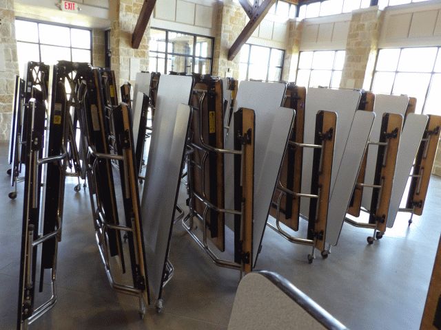 Lot of 6 folding/rolling cafeteria tables with attached seats; Location 117