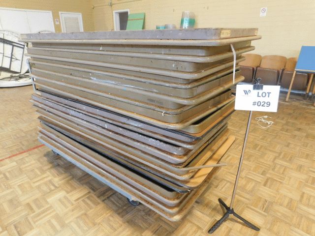 Lot of approximately 17 folding tables. At units have wear and tear, surface and trim damage, some units missing trim. Approximately 72" long x 30" wide x 29" tall.