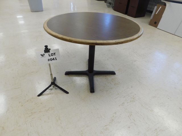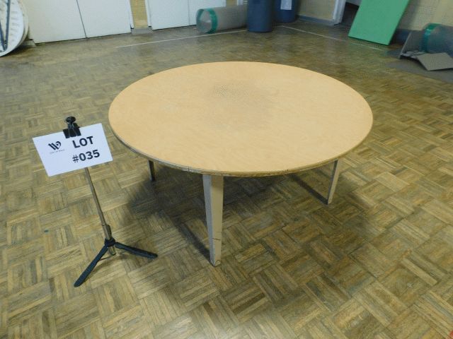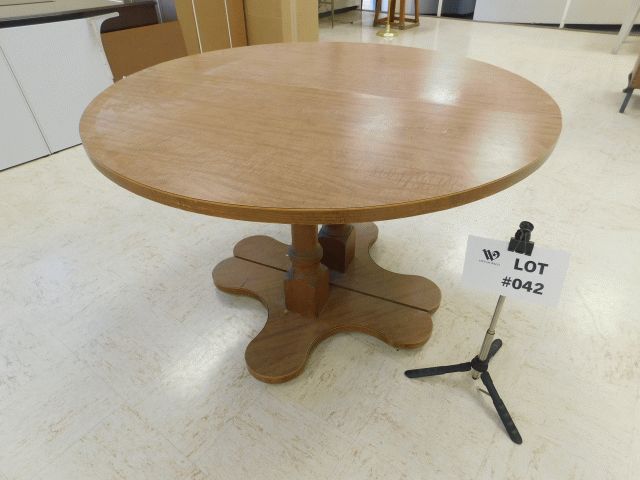Lot of 1 round table, has wear and tear, areas of veneer separation and wood damage. Approximately 48" wide x 48" deep x 30" high.