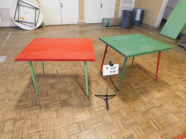 Lot containing 2 retro tables and 5 hand crafted benches. Tables have wear and tear, with wood, paint damage and chipping, and loose legs, Green table is approximately 40" wide x 32" deep x 29.5" high. Red table is approximately 40" wide x 32" deep x 29" high with one bent leg. Hand crafted benches are approximately 48" wide x 11" deep x 17.5" high.