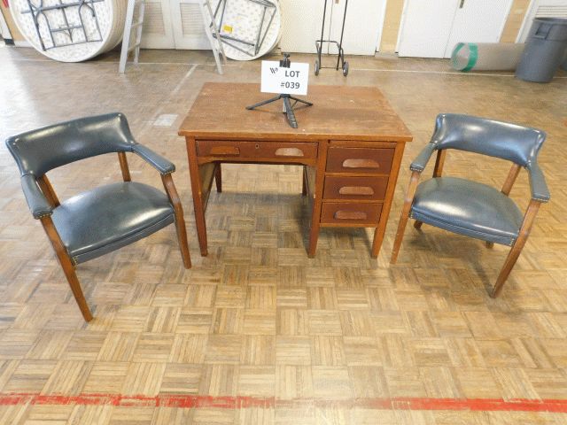 Lot of 1 wooden desk and 2 wood frame chairs, Units have wear and tear, wood and vinyl damage. Wood joints are loose and separating.