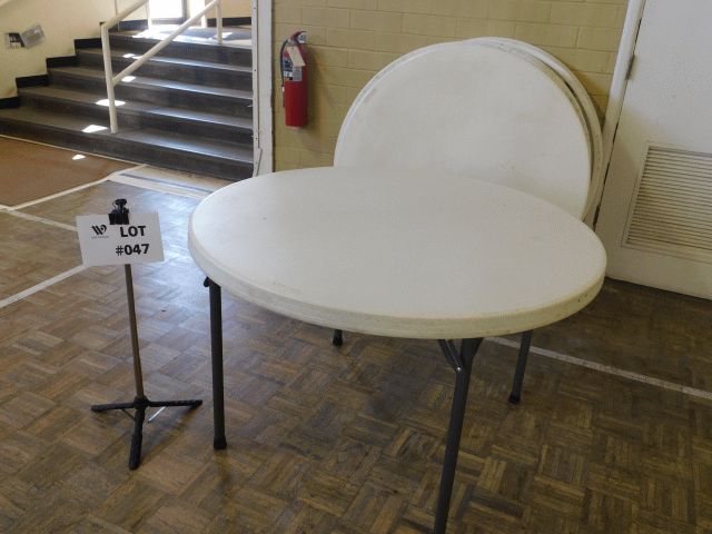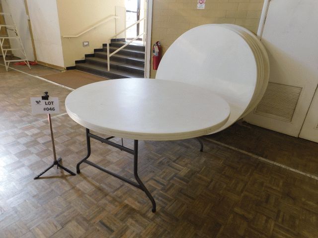 Lot of approximately 7 Life Time round white plastic folding tables, all with wear and tear. Approximately 46" wide x 46" length x 29" high.