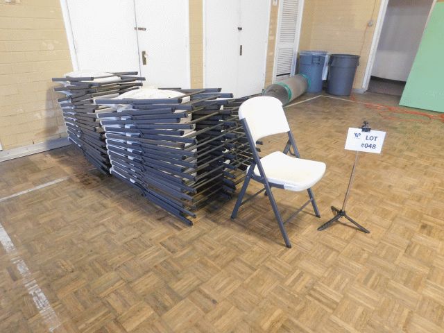 Lot of approximately 40 Life Time white plastic Folding chairs, all with wear and tear, weathering, and rust.