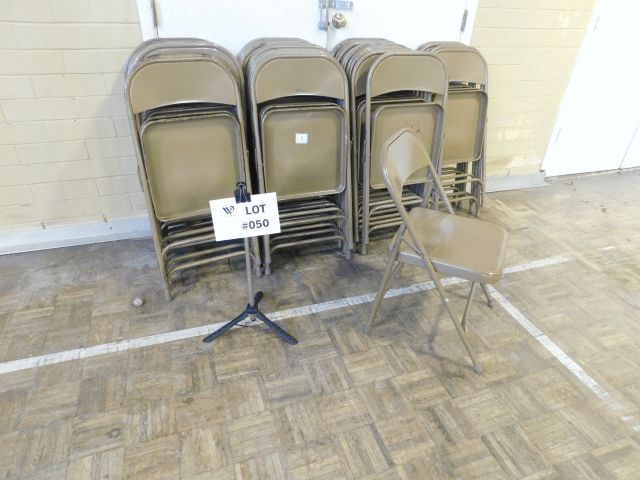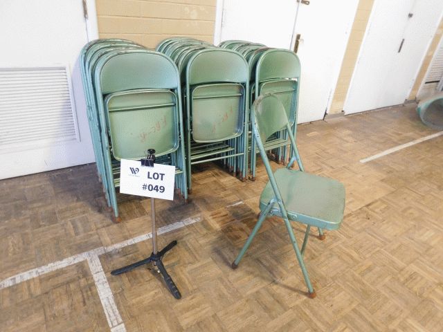 Lot of approximately 60 mixed brand metal folding chairs, all units have wear and tear, rust, and weathering.