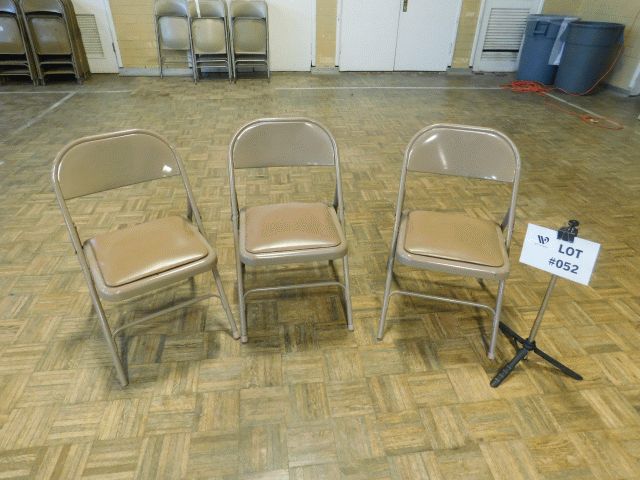 Lot of approximately 3 brown padded metal folding chairs, all units have wear and tear, rust, weathering and missing leg pads