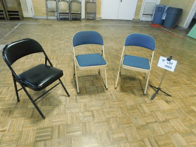 Lot of approximately 3 padded metal folding chairs, all units have wear and tear. 1 black padded chair, and 2 tan and blue Meco folding chairs 1 with leg repair.