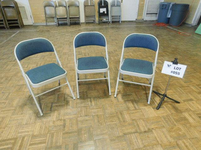 Lot of approximately 3 gray and blue padded metal folding chairs with wear and tear.