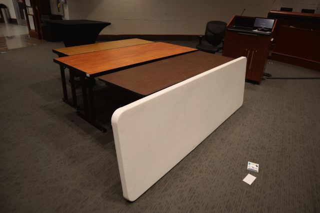 4 tables, Rolling chair, Tall table, Podium - electronics not included; Location 1