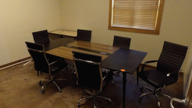 Contents of Administration Office - including 4 office desks, conference table, 6 rolling chairs, bookshelf, table, maps, and other miscellaneous items; Location 118