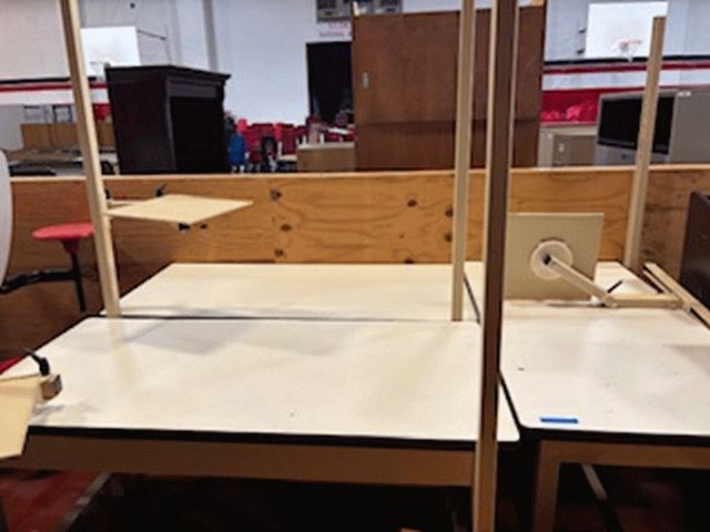 4ft. Tables (4 units), birch top, some markings; Location 1