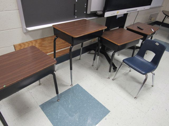 Used (2) 4ft round table, bookshelf, 30in x 60in table, approximately (20) student chairs, (2) open front desks