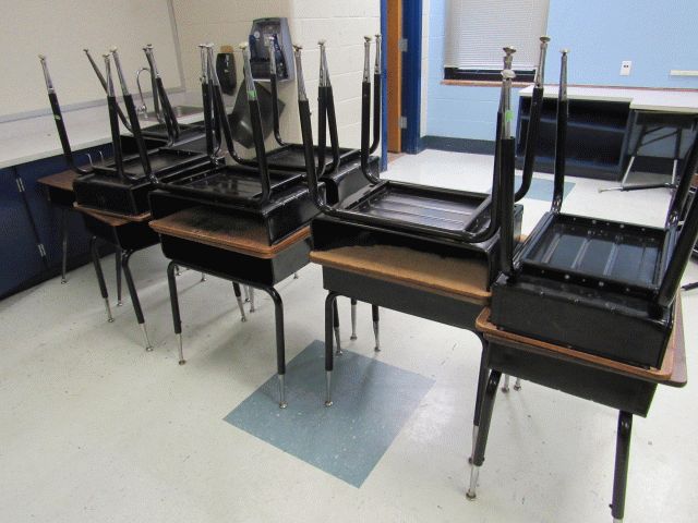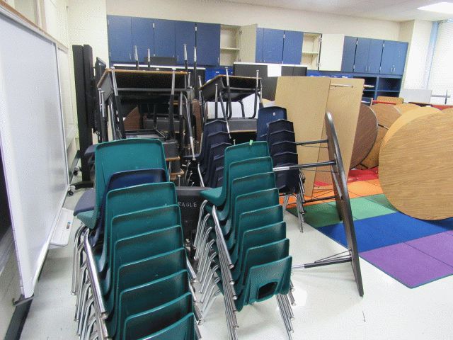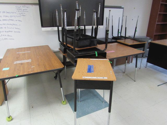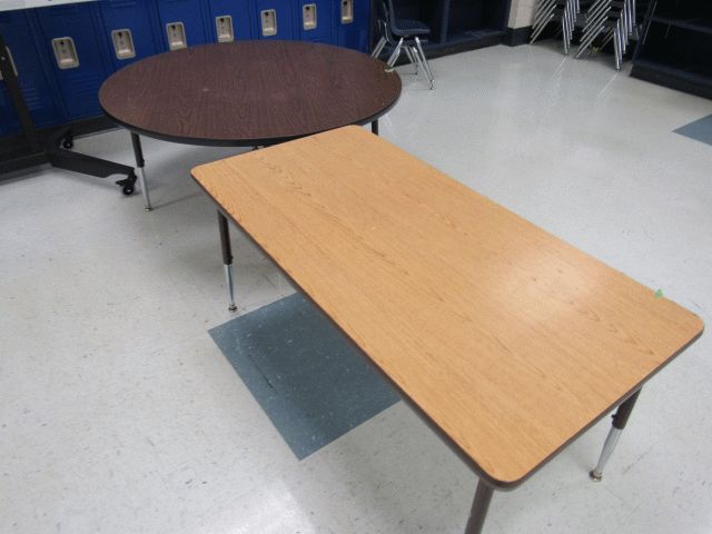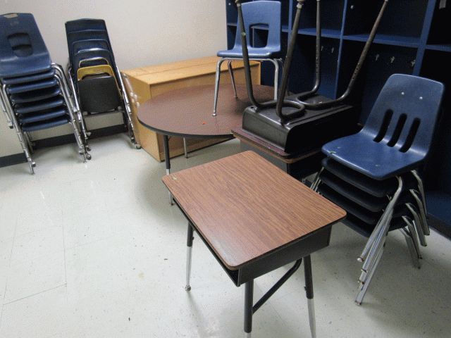 Used approximately (8) 5ft round tables, approximately (20) student chairs, (6) open front desks, bookshelf, various size tables