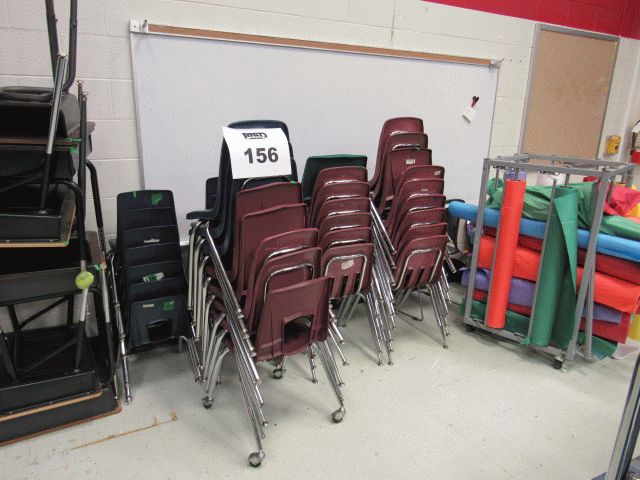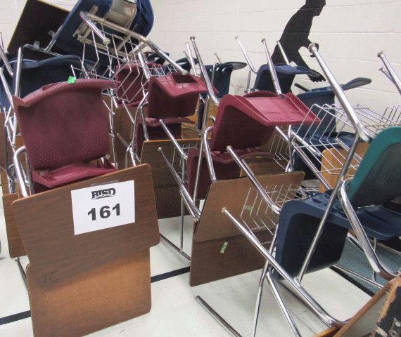 Used approximately (20) student chairs, bulletin paper rack with paper, approximately (5) open front desks
