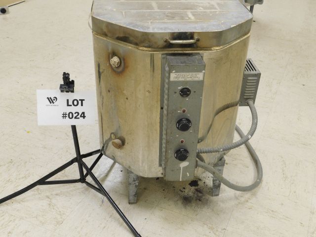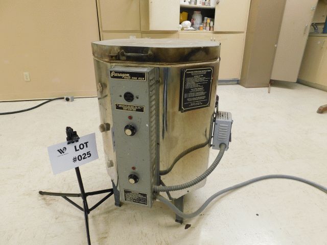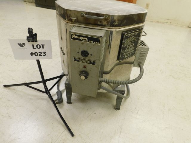 Paragon Kiln. Model #A88B, SN #129183, Volts 120/240/3w, 15amps, single phase, max temp. 2300.Unit has wear and tear, no lid stay, and brick and coil damage. Operational condition is unknown. Approximately 27"wide x 28" deep x 23" high, with stand 31" high