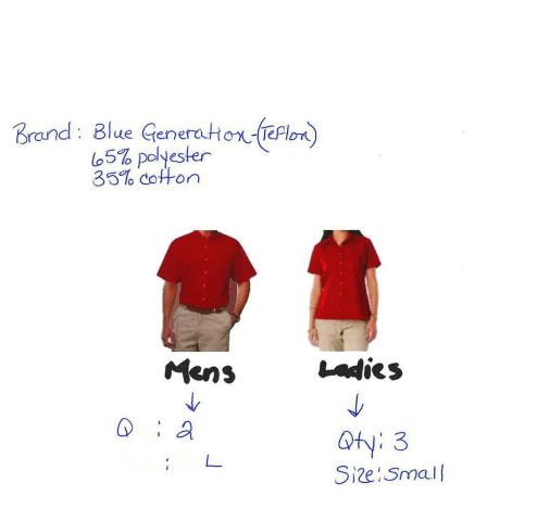 Blue Generation Teflon Red Short Sleeve button down 65 percent 35 percent cotton shirts - 2 Men's Large, 3 Lady's Small; Location 3