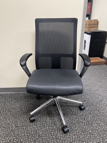 Black office chair with faux leather seat and mesh back; Location 3