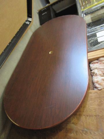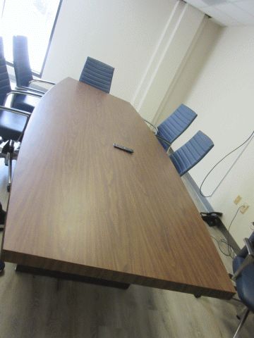 Dark blue camel back loveseat; Conference table; Lamp; Location 1