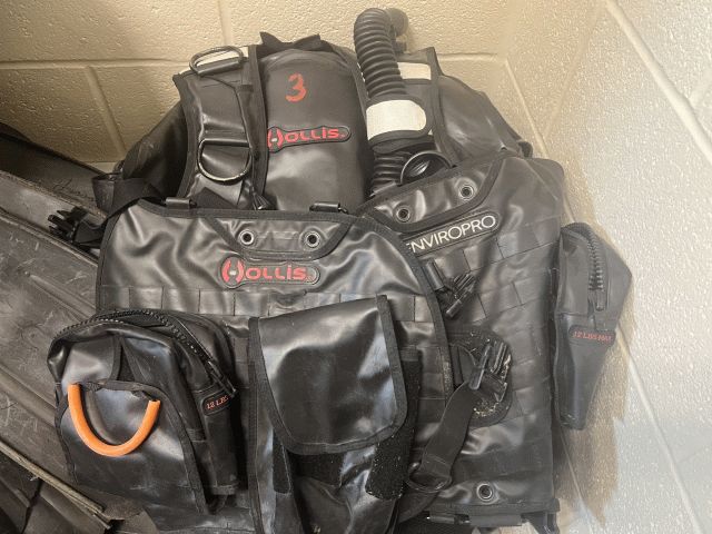 (2) XL Hollis BX SN, (2) L Hollis BX SN, (1) M Hollis BX SN, (36) Fins, (13) Wet Suits, (13) Wet Boots, Miscellous Box, OTS Buddy Phone and (8) Size 80 Scuba Bottles; QUANTITIES ARE APPROXIMATE; Location 3