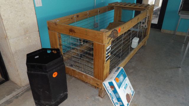 32'' x 98'' x 41'' animal habitat, 6 tables, 1 bag of bedding and 1 trashcan; Location 22