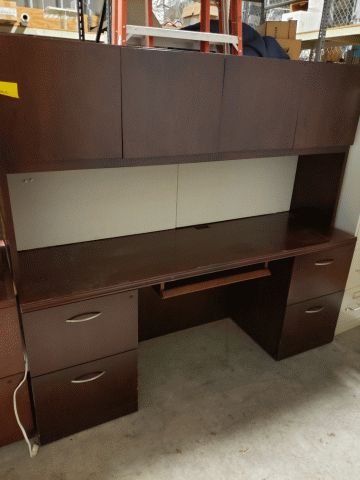 Large Wooden Desk with hutch: 2 drawers on left and 2 drawers on right of desk, 4 door hutch overhead; Some scratches on desk surface; Location 1C