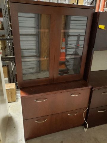 Glass Cabinet with bottom file drawers: glass door-3 shelf wood cabinet on top, 2 drawer wood file cabinet on bottom; Location 1C