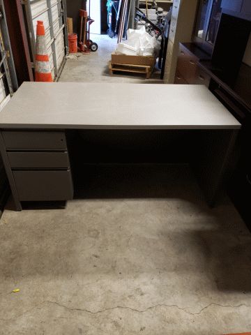 Metal Desk: 3-Drawer gray metal desk, some scratching on desk surface; Location 1C