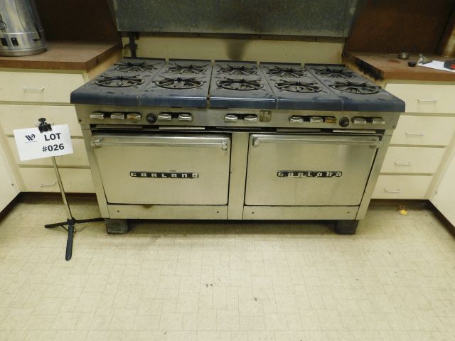 Garland gas kitchen stove, ten burners and two ovens Unit Has wear and tear, rust oven doors do not close all the way. Operational condition is unknown. Approximately 58" wide x 34" deep x 32" high. Winner is responsible for removal from location.