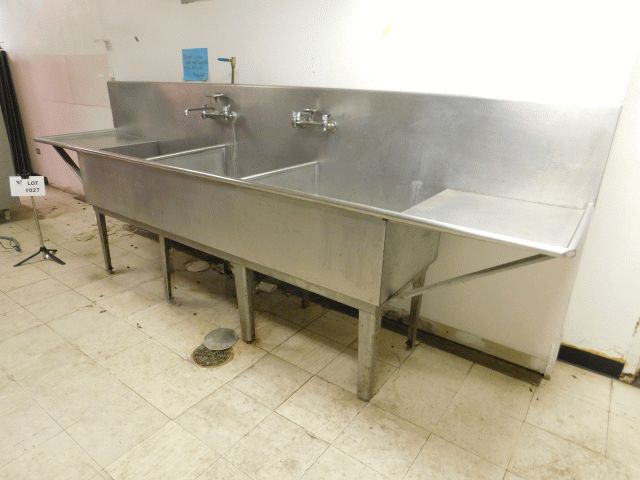 Lot contains stainless steel sink. Unit has wear and tear. Operational when removed from service. Approximately 137" wide x 27" deep x 37" sink height, 53" high with splash board. 3 sinks are Approximately 29" wide x 24" x 15" deep.