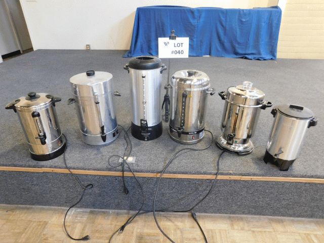 Lot of approximately 6 coffee urns, all units have wear and tear, and damage. Operational condition is unknown. 1 Winco ECPU-100 Nd100-156 Coffee boiler with small amount of damage to lid, 1 Hamilton Beach D50065, 1 Regal Wave K7001 with dent in lid, 1 West Bend 58002-0929 (missing power cord), 1 Proctor Silex Commercial 45100, 1 Nesco WI54241