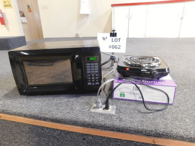 Lot containing 1 Walmart microwave model # EM720CGA-B 120V approximately 17"w x 12" deep x 10" high, and 1 Rival Single burner model# HP102-U2. Both units will power on, wear and tear, operational condition is unknown.
