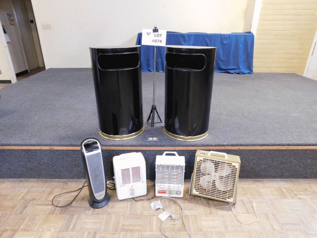 Lot containing approximately 3 heaters, small box fan, and 1/2 round trash cans. 1 Lasko Ceramic Element Heater model #CT22766, 1 Prostandard Model #83031, 1 Dayton model #3VU31A and 1 Hunter small box fan approximately 9" deep x 16" wide x 16" high. All units have wear and tear, will power on. 2 United Receptacle 1/2 round trash cans with liners with wear and tear, approximately 9" deep x 17 3/4" wide x 32" high