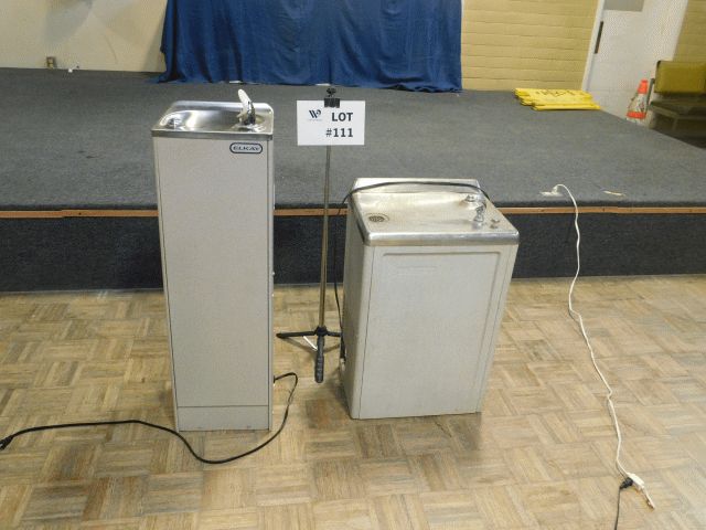 Lot containing 2 water fountains, 1 Halsey W. Taylor Co. wall mount water cooler fountain non- filtered Model #WM8A .Approximately 18"wide x 15" deep x 29" high. 1 Elkay Model #FD700 3 IJ, floor mount , non-filtered water cooler fountain. Approximately 28"wide x 30" deep x 64" high. Units have wear and tear, Operational condition unknown.