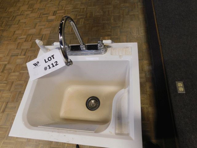 Lot of 1 plastic utility sink with composite cabinet has wear and tear. Approximately 24"wide x 21" deep x 36" high at sink top. Sink is approximately 20" long x 15" wide x 14"deep.