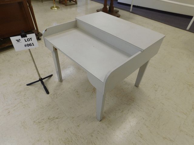 Lot of 1 white youth desk, unit has wear and tear with trim and wood damage. Approximately over all size 36" wide x 34" deep x 30" high, desk area 34" wide x 17" deep x 26" high.