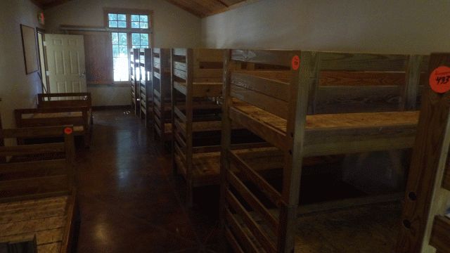 Lot of 7 1/2 Bunk Beds, 1 table, 6 chairs, 4 trash cans and 1 broom; Location 20