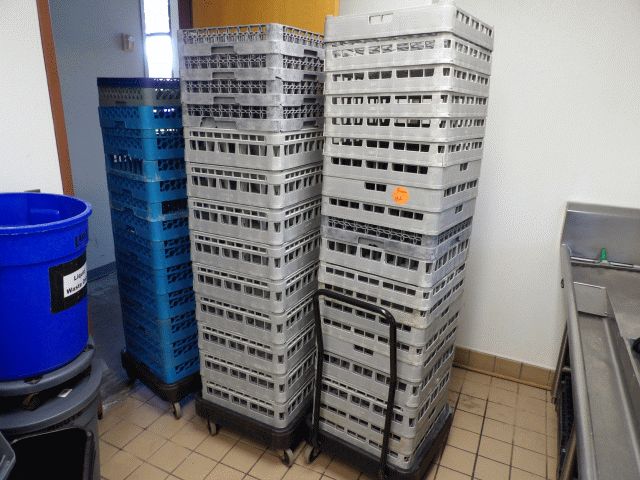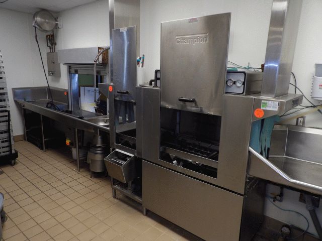 Champion wash line including rinse section, insinkerator, finish line, top and bottom shelves. Commercial kitchen equipment at this location is powered by electricity OR propane. If not specified in the lot, bidder is responsible for inspecting and determining power source; Location 117