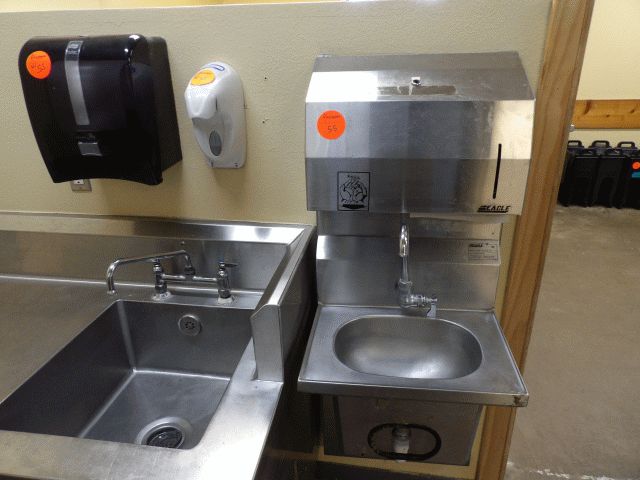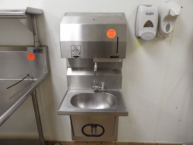 Stainless steel Eagle sink with built in napkin and soap dispenser. Gojo Soap dispenser; Location 117