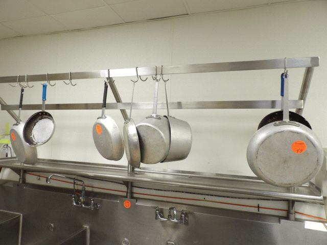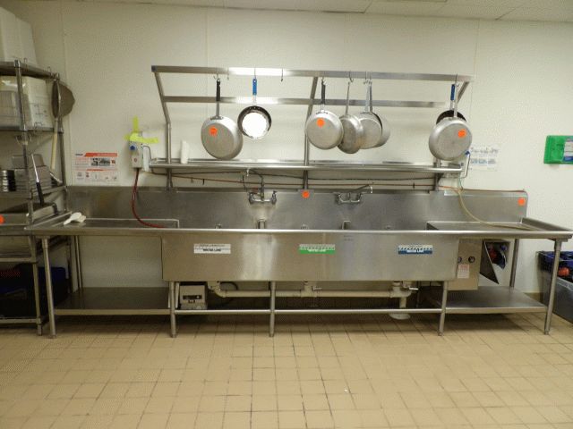 3 section sink with drain boards, top and bottom shelves, and pot rack. Pots and pans NOT included 171''x 31''; Location 117