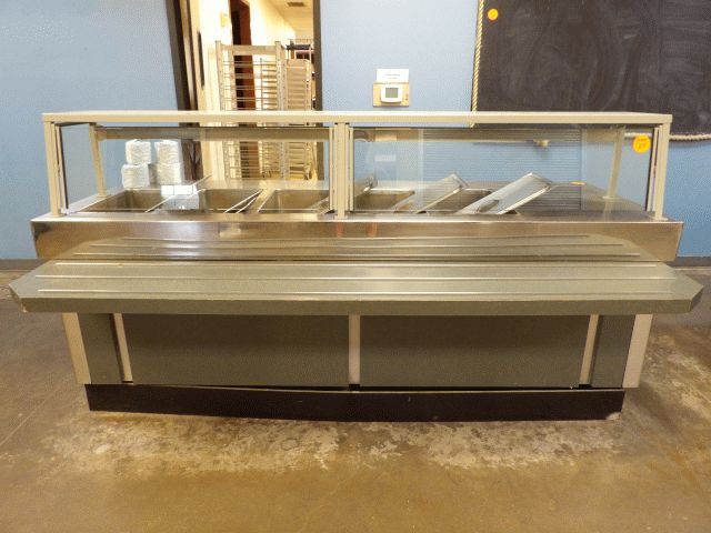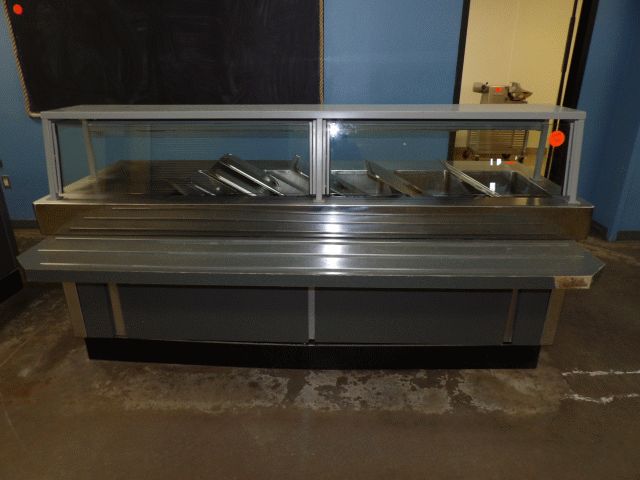 Stainless steel food service line - 5 heated compartments with lids, tray slide, splashguard, and underlighting. 8'x 50''; Location 117