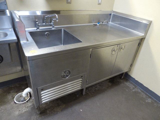 Stainless steel prep table with sink, 2 door cabinet, and backsplash. 65''x 30''; Location 117
