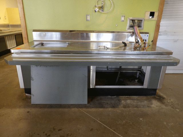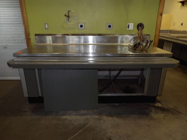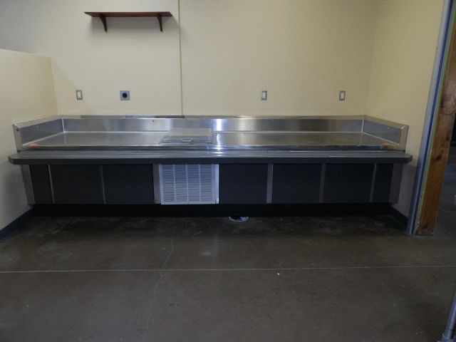Stainless steel table with refrigerated section and tray slide. 150''x 50''; Location 117