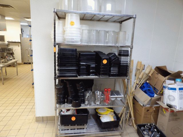 Misc. plasticwares, rack, pitchers, tiki lights, and other misc. items.; Location 117
